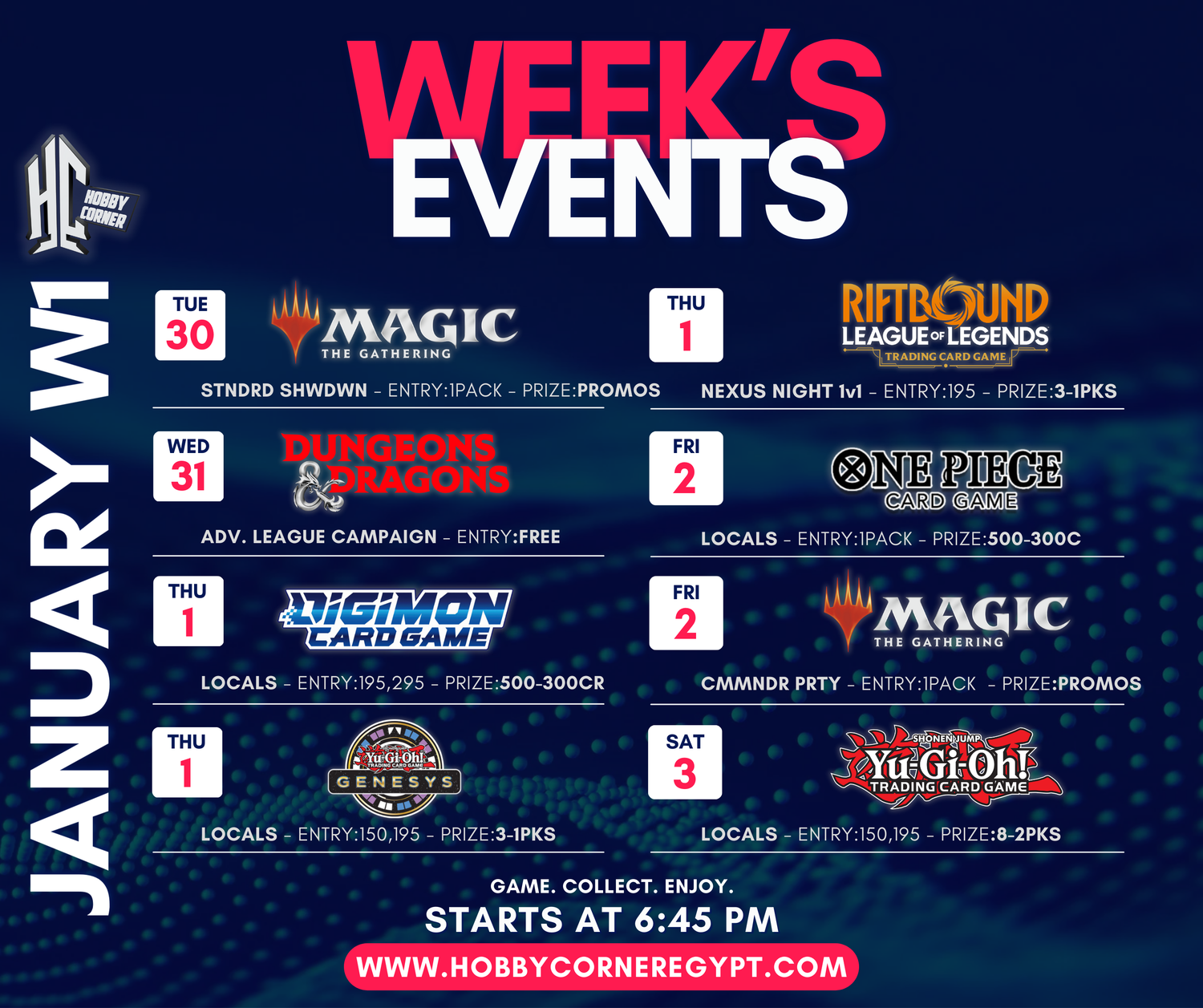 Stay up-to-date with our weekly tournaments and don't miss out on the exciting challenges we have for you. Whether you're a seasoned player or just getting started, our tournaments offer something for everyone. Check out the schedule below and mark your calendar for an action-packed week of friendly competition and great prizes!