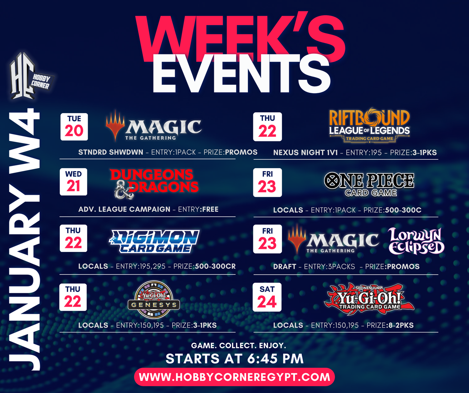 Stay up-to-date with our weekly tournaments and don't miss out on the exciting challenges we have for you. Whether you're a seasoned player or just getting started, our tournaments offer something for everyone. Check out the schedule below and mark your calendar for an action-packed week of friendly competition and great prizes!