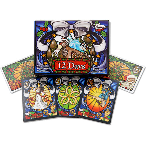The holiday-themed 12 Days takes the familiar "Twelve Days of Christmas" song and twists it into a quick-playing card game. Over twelve rounds, players try to re-gift unpopular cards while keeping cards that are strong enough to win the day, while also keeping a careful eye for bonus scoring at the end of the game. The gift deck consists of eighty cards: one partridge in a pear tree, two turtle doves, and so on up to twelve drummers drumming, as well as one card each for Mr. and Mrs. Claus. Shuffle this deck, then deal each player twelve cards. Each round a new holiday card is up for grabs, with the cards ranked from 1 to 12 and being worth 1-12 points. In a round, a player: Gifts a present to the player to his left, Opens presents and tries to win the day with the best present, and Buys a new gift to refill his hand. More specifically, all players simultaneously pass one face-down gift card to their left-hand neighbor. Then everyone chooses one gift card in hand and reveals them simultaneously. Whoever plays the lowest gift card wins that round's holiday card; in the event of a tie for lowest, with the Clauses counting as zero, then the next lowest card wins. Each player then draws one card to bring their hand back to twelve cards. After twelve rounds, players score points for each holiday card they've collected. In addition, whoever holds the most gift cards for each rank scores as many points as that rank, with all tied players scoring in the event of a tie. Whoever has the most points wins. Happy holidays!