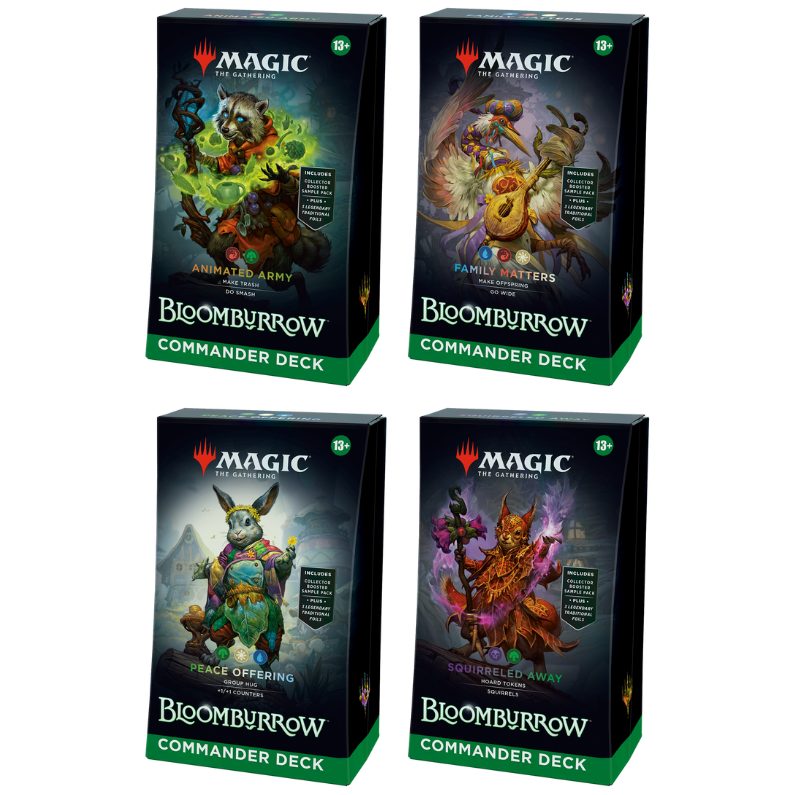 في لعبة Commander، يتحد أربعة لاعبين لإظهار قوتهم واستراتيجيتهم، ويتفوق لاعب واحد. كل مجموعة بطاقات Bloomburrow™ Commander الجاهزة للعب، والمكونة من 100 بطاقة، تُسهّل على محبي Commander في متجرك الحصول على مجموعة واللعب فورًا.