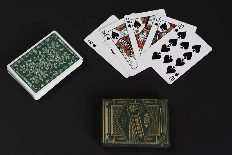 علبة "غرين مونارك" مصنوعة بشكل فريد من طبقتين، وهي أكثر علب التخزين متانةً على الإطلاق. تُصنع أوراق لعب "مونارك" في الولايات المتحدة الأمريكية على ورق معتمد من مجلس الإشراف على الغابات (FSC) ومستخرج من غابات مستدامة. وتُطبع البطاقات نفسها بأحبار نباتية.
