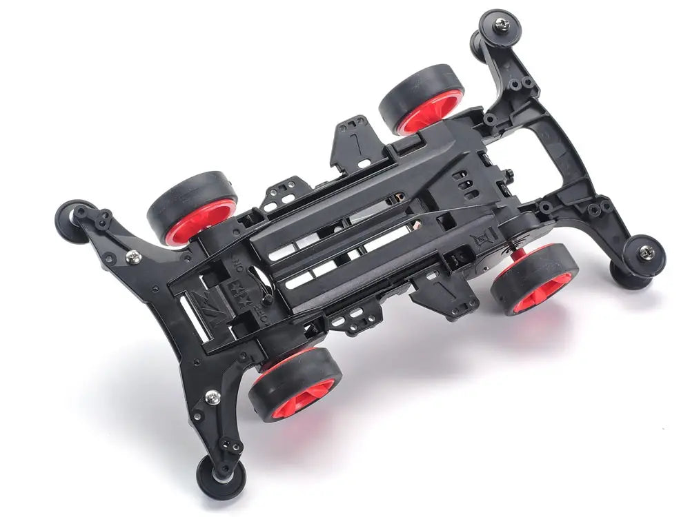 This assembly kit creates the Neo-VQS, a stylish and speedy Mini 4WD racer inspired by its predecessor the Vanquish Jr. The refined body is molded in black, and paired with the brand new VZ chassis, also molded in black along with its A parts. Red 5-spoke wheels are joined by black low-profile tires, whilst an additional accent is provided by marking stickers with red and white elements.