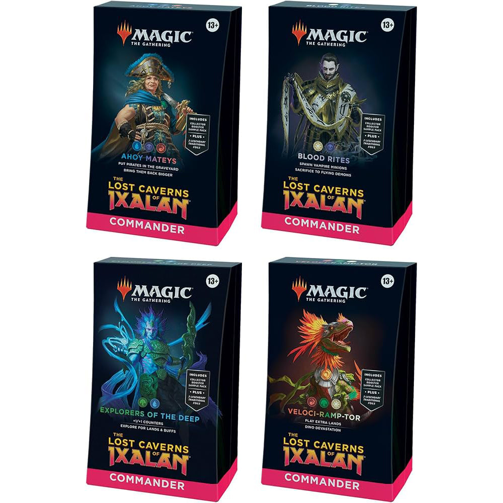 - المحتويات - جميع مجموعات The Lost Caverns of Ixalan Commander الأربعة؛ كل مجموعة مكونة من 100 بطاقة تأتي أيضًا مع مجموعة عينات Collector Booster مكونة من بطاقتين، و1 Foil-Etched Display Commander، و10 رموز على الوجهين، و1 متتبع حياة، و1 صندوق مجموعة.