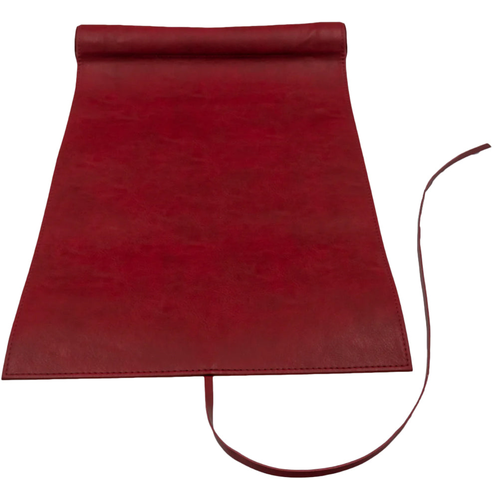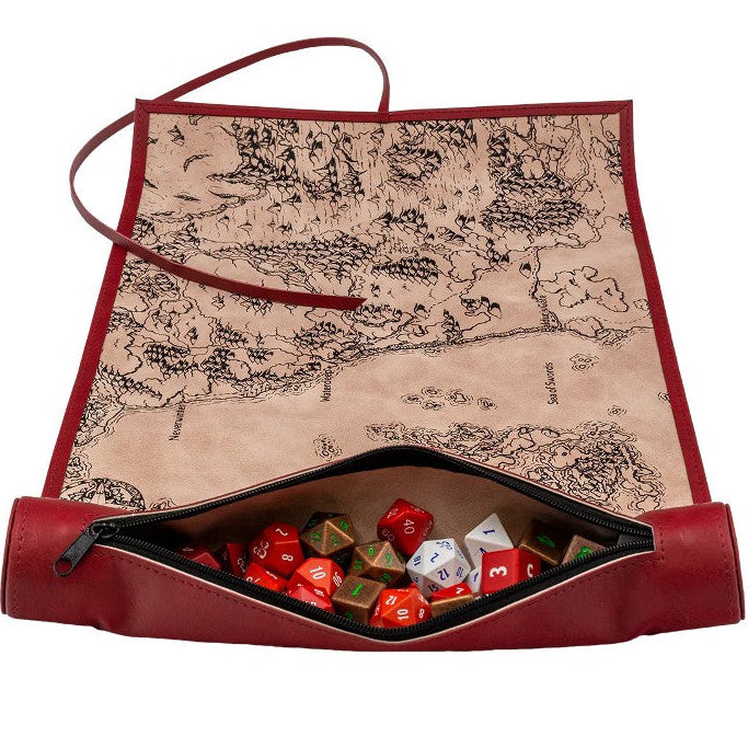 The D&D Dice Scroll Map offers premium dice storage and functions as a dice rolling mat. This Sword Coast Map, illustrated by Deven Rue, is made with a durable Burgundy Red leatherette exterior and a cream-colored backing for the map on the rolling surface with D&D ampersands on each end. This soft roll-out mat will safely store your dice and protect your table. The zippered compartment holds 20+ dice. The rolling mat rolls around the zippered compartment and is secured shut with a single tie to look like an ancient leather-bound scroll.