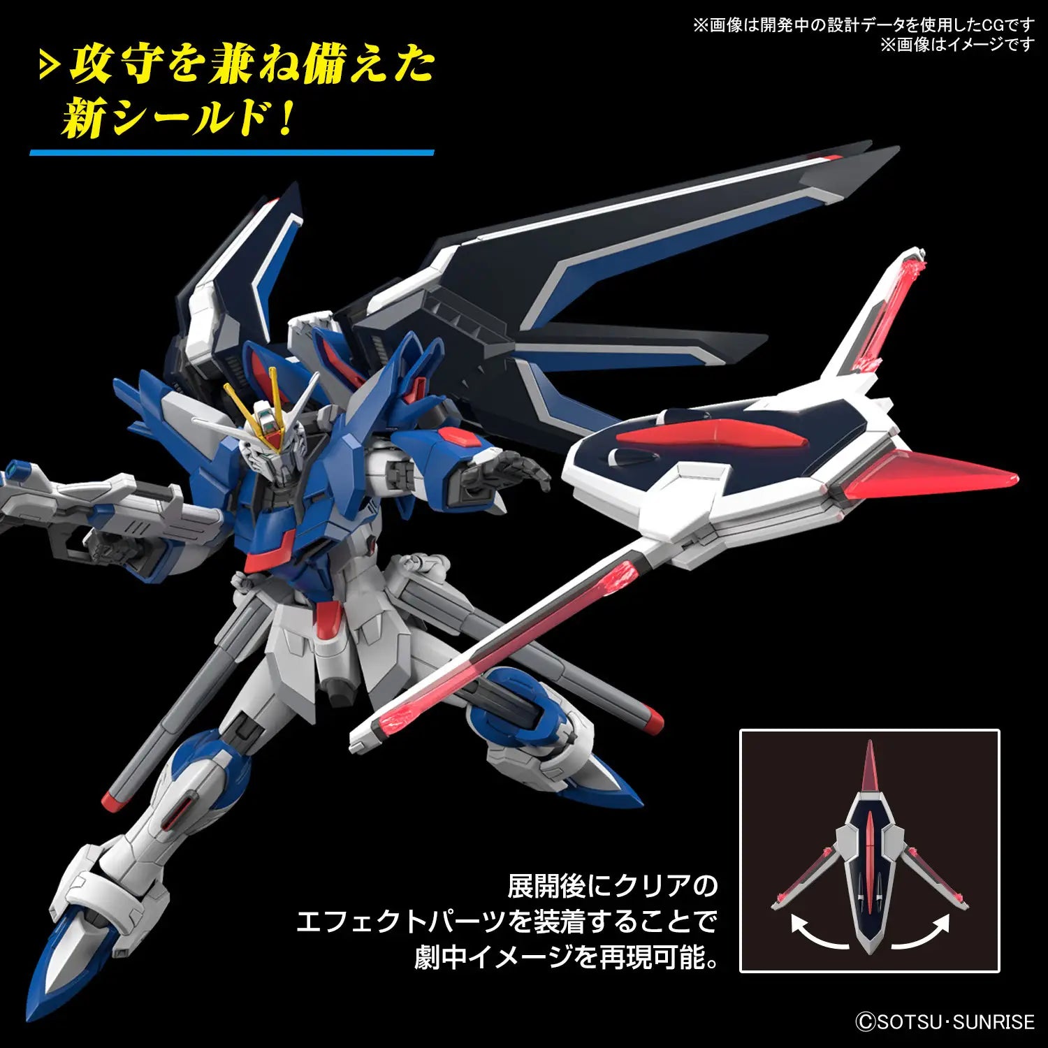 It's equipped with the "Seed Action System" internal structure that specializes in reproducing impressive poses! It can transform into its MA form by replacing some parts. A new shield combining offense and defense is included. Clear parts are also included for the shield. The beam shield also uses polarized molding that changes color depending on the angle at which it's viewed for a beautifully shining effect!