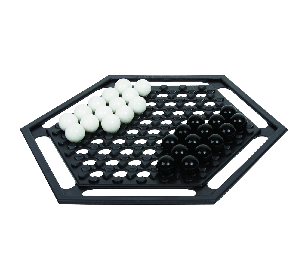 This beautiful and functional board has room for two teams of large marbles. Players take turns pushing the marbles around the board, with the goal of pushing six of the opposing player's marbles off the board. The central idea is that a column of marbles has weight given by the number of marbles in line. Someone will need to push with a heavier group of marbles in order to push the column along that axis. However, with six possible directions, it's difficult to defend yourself perfectly. Also, it's possible to play the game with up to six players when supplemental marble sets are purchased.