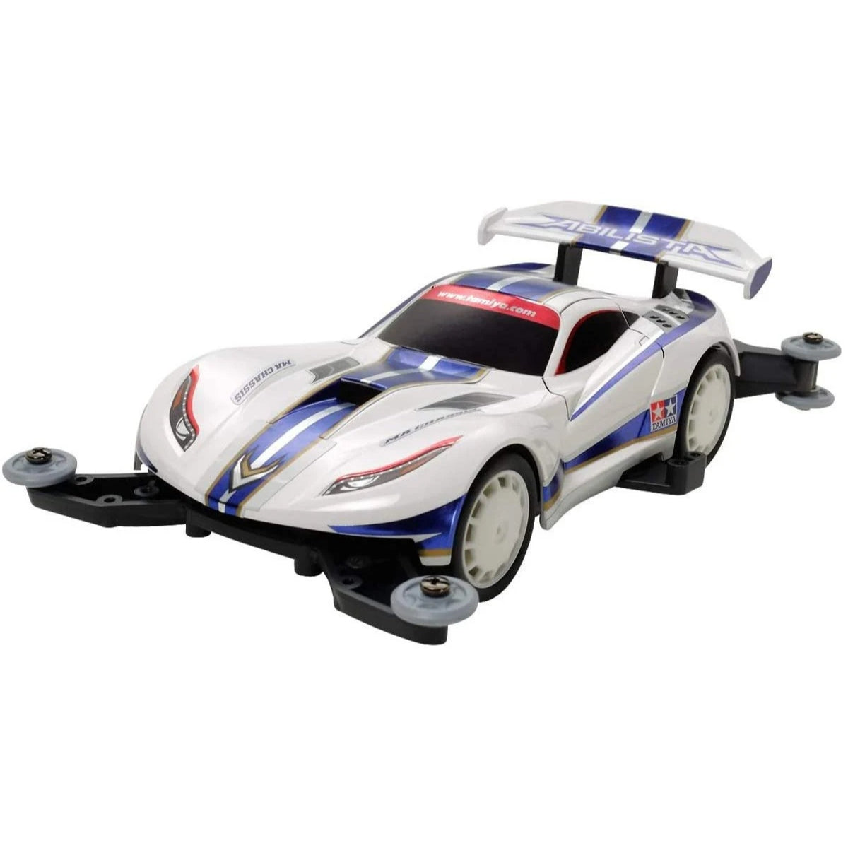 The Abilista is the fifth model to appear on the midship motor layout MA Chassis. Just one glance at the alluring super sports car-inspired body will be enough to convince you that this is a must-have model, with the stylish long nose short-deck form accentuated by sumptuous curves. Bulging front and rear fenders accentuate the slimline center of the car nicely, while an eye-catching wing not only gives a sporty look, it also has air outlets that combine with the front intake to boost the model's aerodynamics. The color scheme is an understated yet effective white with blue tones and gold trim, with metallic stickers included to recreate headlights, windows and taillights. The model rolls on white dish-type wheels with low-profile tires.