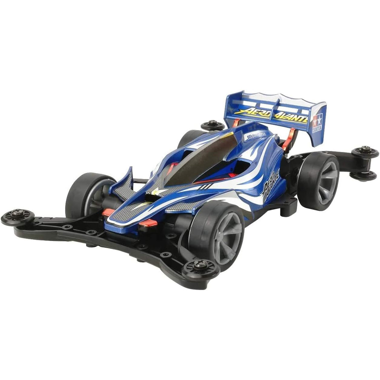The Mini 4WD Avante Jr. has its roots in the high-performance R/C 4WD racing buggy Avante. The body design features a wedge-shaped nose section, sleek body lines, and a large rear wing, and these features had been carried over to other variants such as the Super Avante, Avante Mk.II, and Avante X. The latest design to incorporate this Avante pedigree is the Aero Avante.