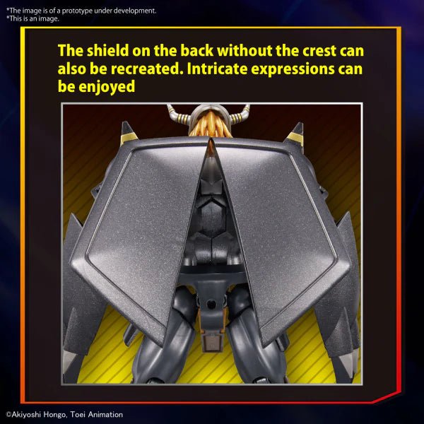 The black armor uses a metallic molding color to achieve an impressive coloring. Various poses are possible, such as raising both arms, arching the chest, and spreading the legs wide. A wide range of motion can reproduce the action of wielding the special moves "Dark Gaia Force" and "Dramon Killer" in the play. The shield can be moved independently on the left and right and can be angled according to the pose.