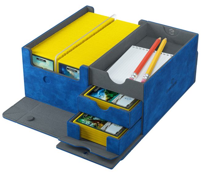 It contains a total of 4 drawers: 2 removable drawers with ingenious magnetic flaps that guarantee effortless pulling-out and easy access to sleeved cards, or even entire decks; right down to the last card. Plus 2 additional extra-large trays for even more tokens, dice, accessories, etc. The top-level compartment of the Games’ Lair 600+ can be used for life pads, oversized cards, traditional writing pads, to store pen-and-paper accessories, and many other different needs.