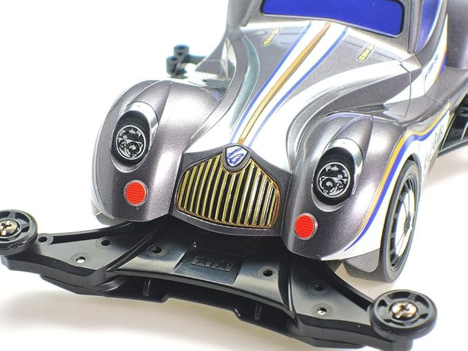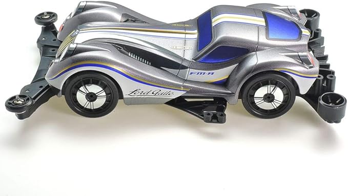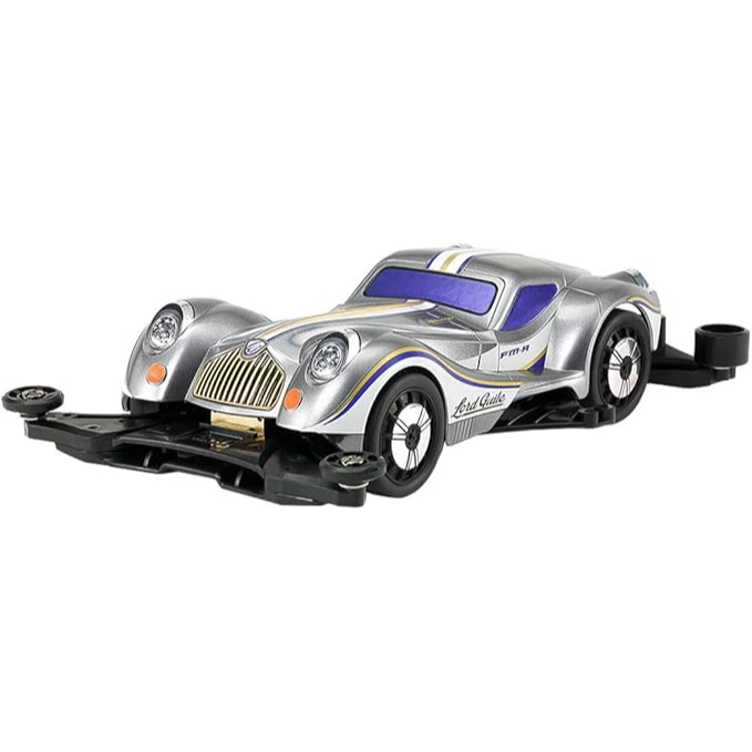 This assembly kit creates Lord Guile, an exciting Mini 4WD racer with strong classic car themes in the sporty, light gun metal color long nose body design. The front grille section is a separate part for super realism and a streamlined paint job. Gold and purple metallic marking stickers add further elegance to the car, and other stickers depict headlights and more.