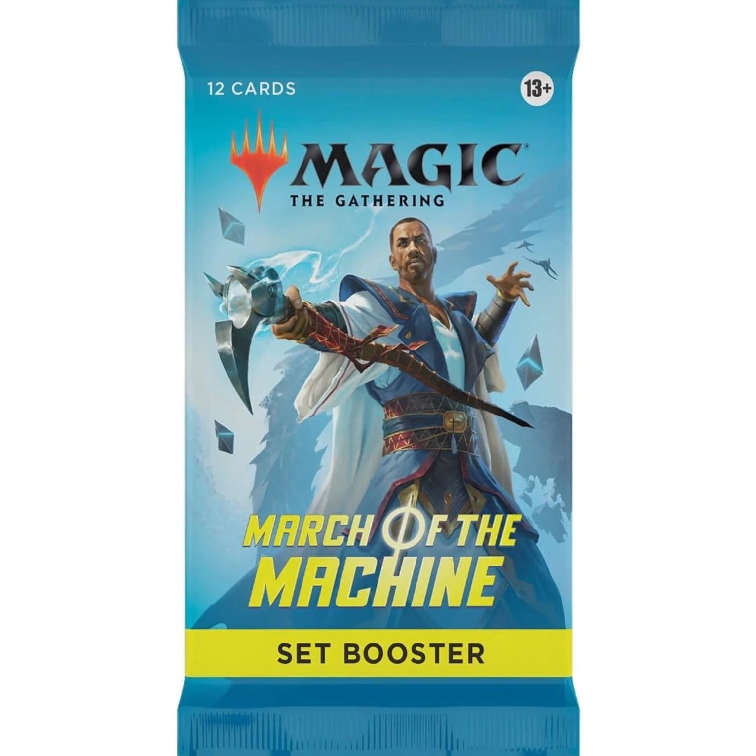 Each March of the Machine Set Booster contains 12 Magic cards, 1 Art Card, and 1 token/ad card, Helper card, or card from “The List” (a special card from Magic's history—found in 25% of packs).
